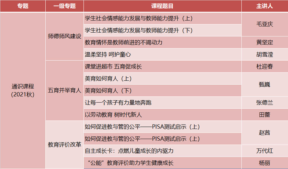 通识课程面向全体教师,围绕师德师风建设、五育并举、教育评价改革三个方面,结合了新时代的教育改革动态,以把握新时代教育需求、培养教师教育情怀、了解儿童发展规律为目标。