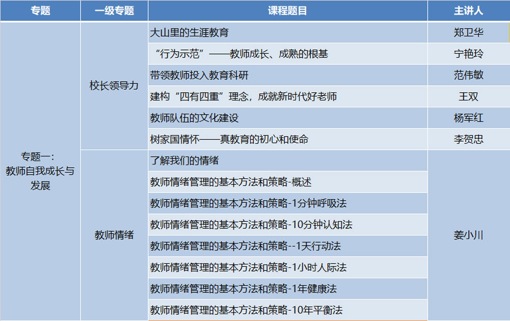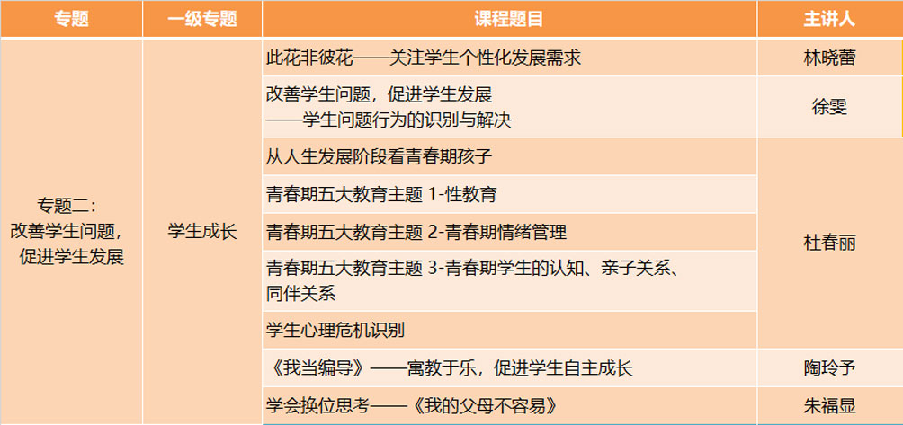 本学期的学生问题识别与自主发展专题,内容设计从教师的角度出发,课程重点落实在教师面对学生表现出来的问题如何应对及实施方向,其中的学生青春期主题更是全面地介绍了青春期的产生、应对及学生心理变化等,详细给出了教师面对这一时期孩子,应做好的准备。